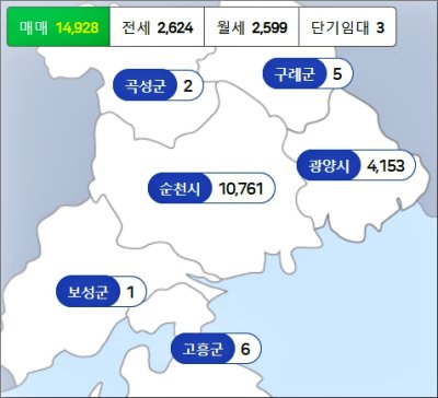 매물을 보시면 순천시에만 만 건이 넘고 광양시도 4천건이 넘습니다. 타 지역에 비해 순광교차로 부동산이 매우 활성화 되어 있는 것을 확인할 수 있습니다.